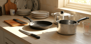 包丁1本、まな板、フライパン、お鍋、計量器具があれば、ほとんどの料理は作ることができます。