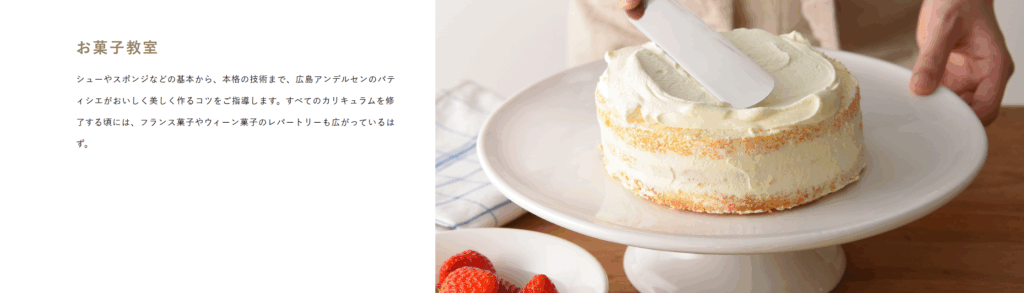 広島の老舗ベーカリー「広島アンデルセン」が運営するパン・お菓子教室。本通りの店舗3階にあるカルチャールームで、熟練のベーカーやパティシエから本格的な技術を学べます。
